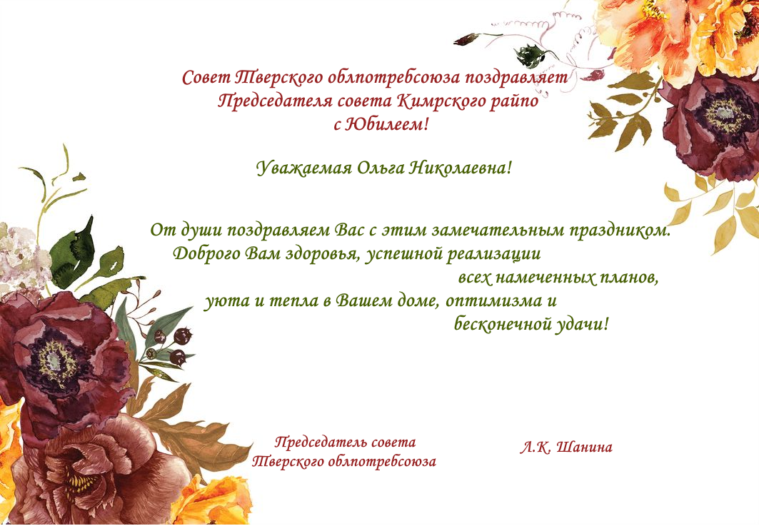 Совет Тверского облпотребсоюза поздравляет Председателя совета Кимрского райпо с Юбилеем!