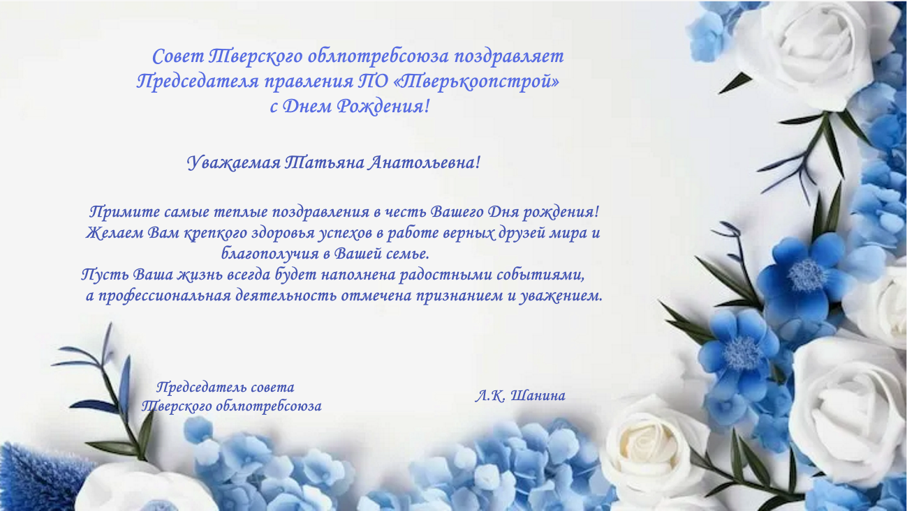 Совет Тверского облпотребсоюза поздравляет Председателя правления ПО «Тверькоопстрой» с Днем Рождения!